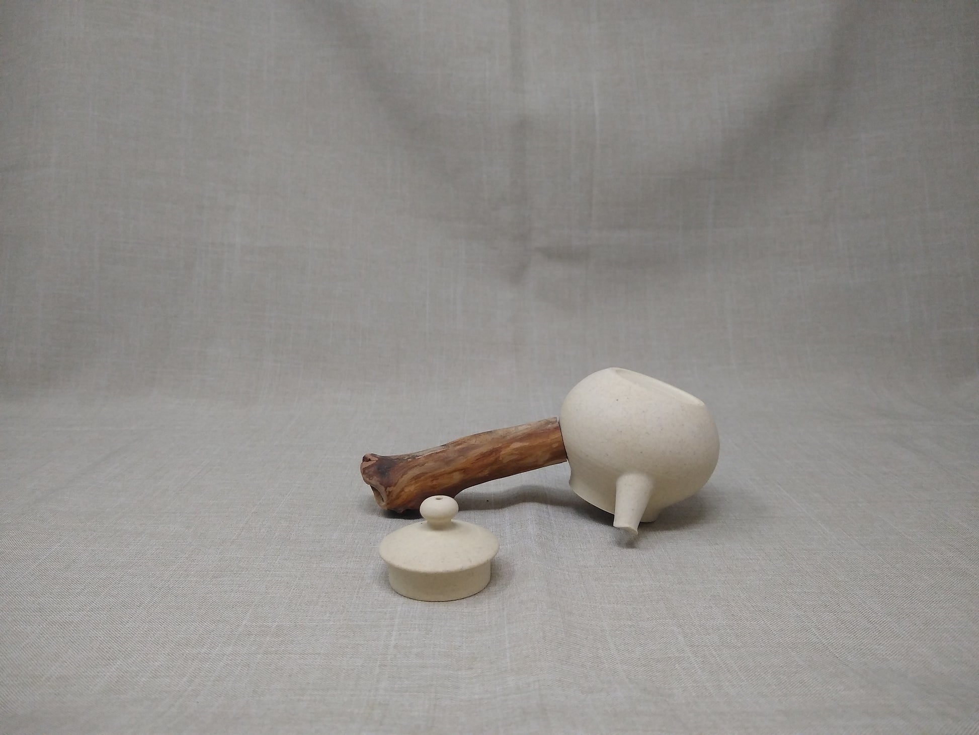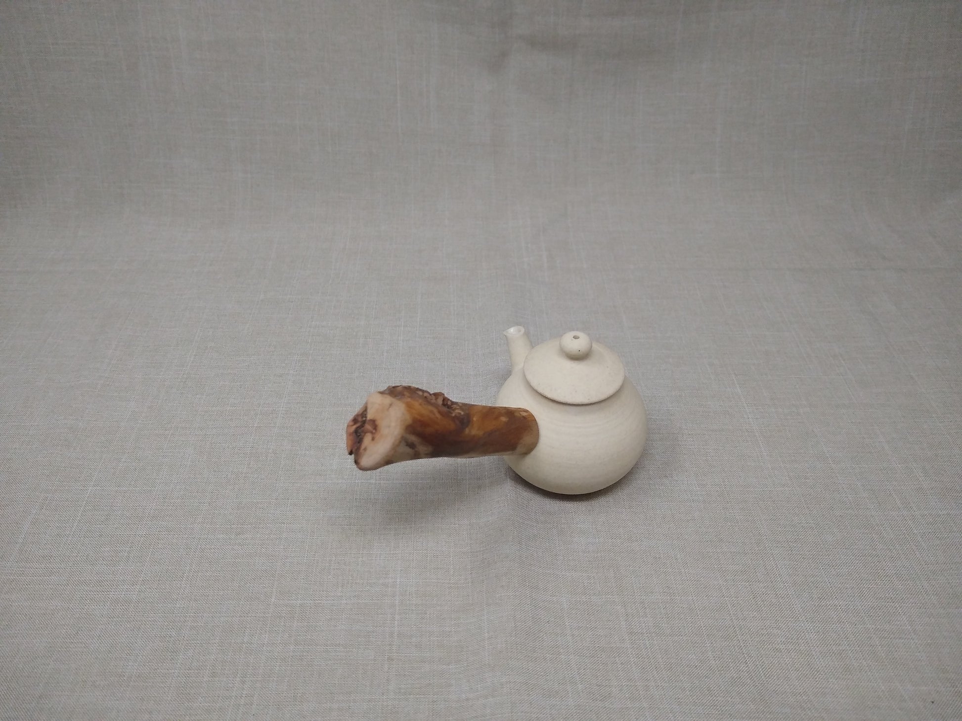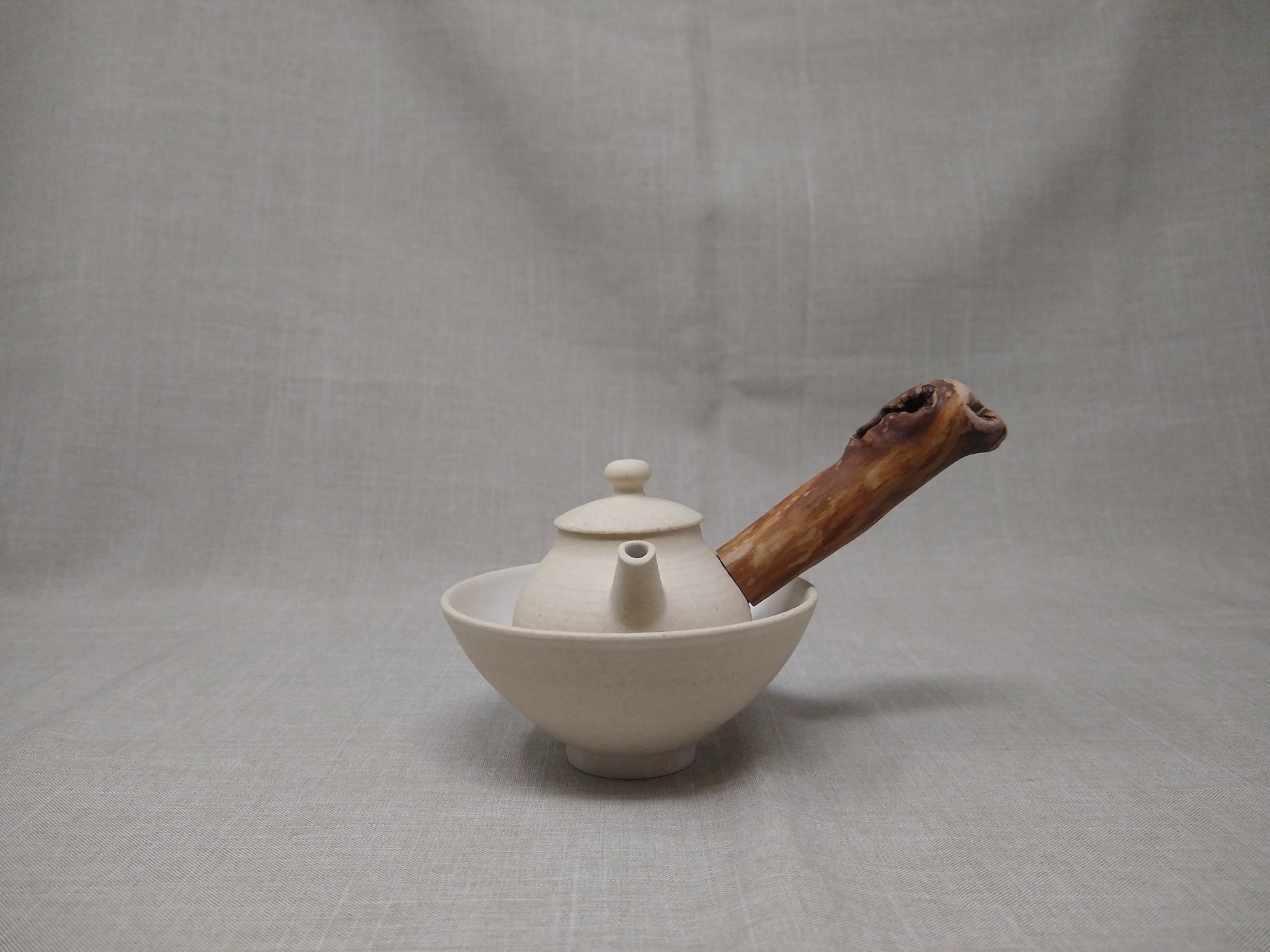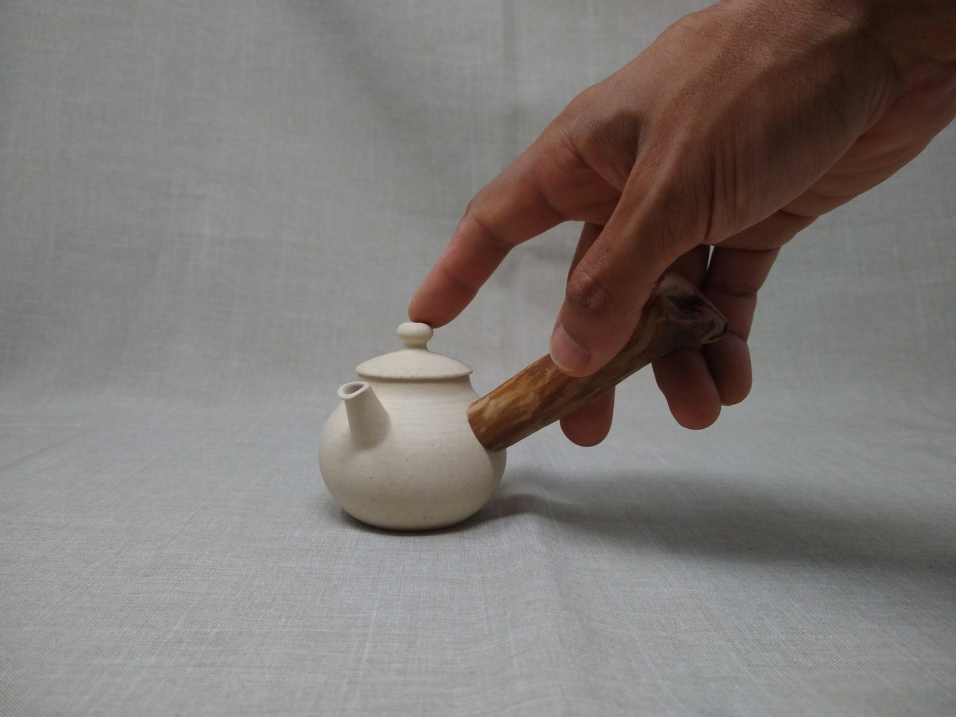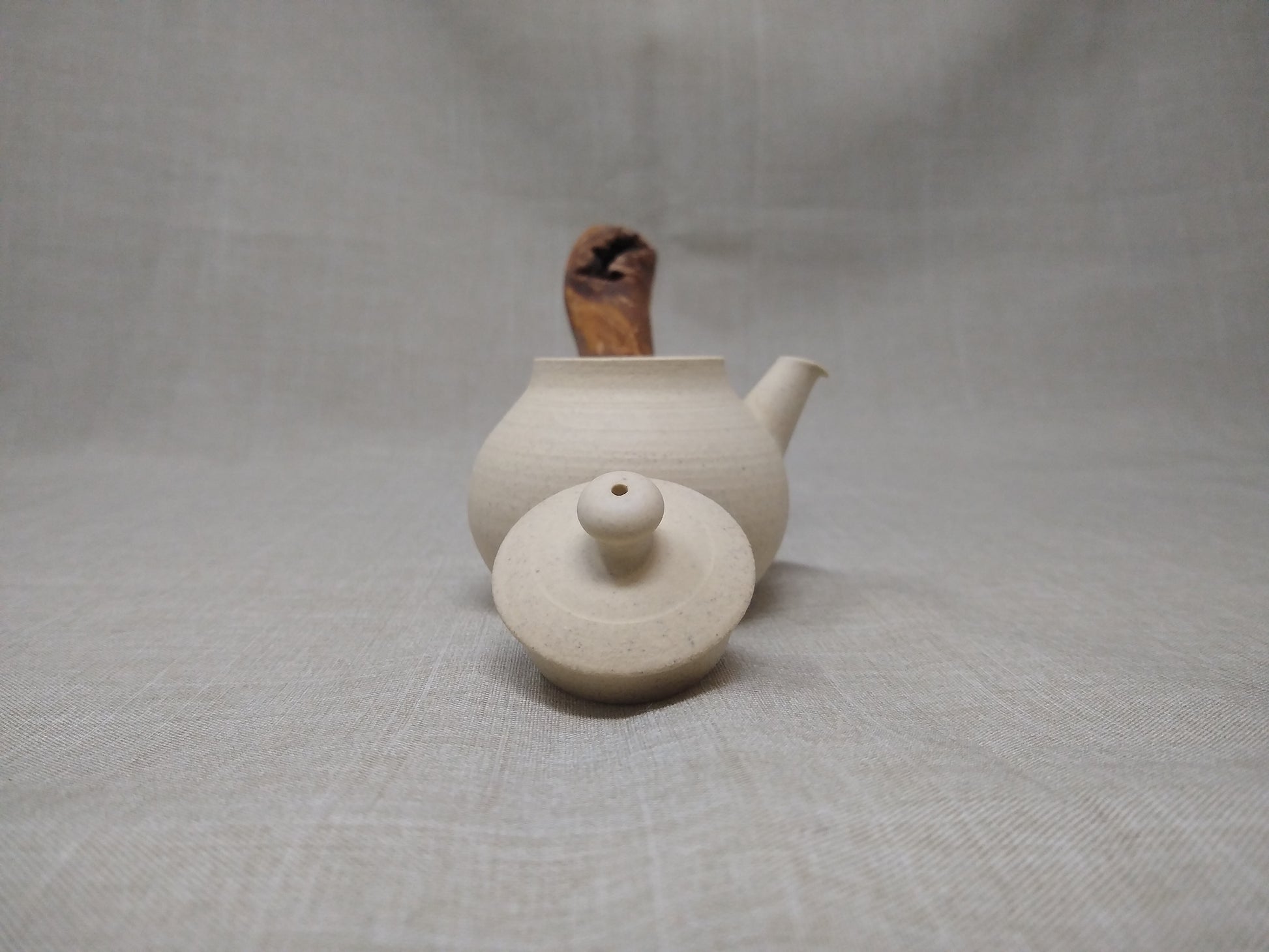 This kyusu was made with a mineral rich clay. The exterior is finished with a crackled matte white glaze. The interior of the teapot has a soft white glaze which helps make the color of the tea being steeped more visible. The soft white glaze also allows some of the natural clay features to come forth. The teapot lid is measured and trimmed with precision to ensure that it fits nice and tight. The built in strainer has approximately 159 small holes that are 1 millimeters in diameter. This strainer functions excellent with all teas.