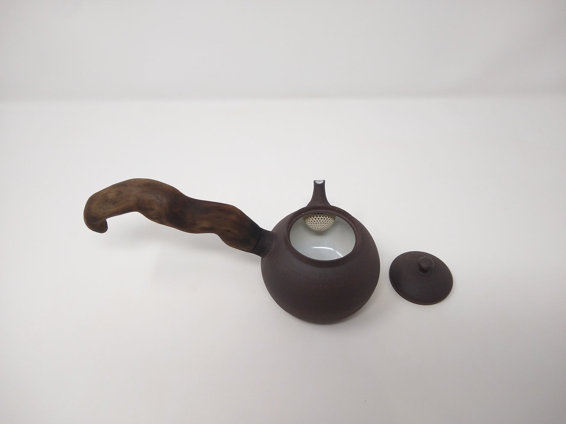 This kyusu was made with a dark brown mineral rich clay. The exterior is not glazed, exposing the marvelous attributes of this dark clay. The interior of the teapot has my signature soft white glaze which helps make the color of the tea being steeped more visible. The soft white glaze also allows some of the natural clay features to come forth. The teapot lid is measured and trimmed with precision to ensure that it fits nice and tight. The built in strainer has approximately 259 small holes that are 1 millimeters in diameter. This strainer functions excellent with all teas.