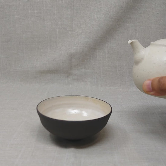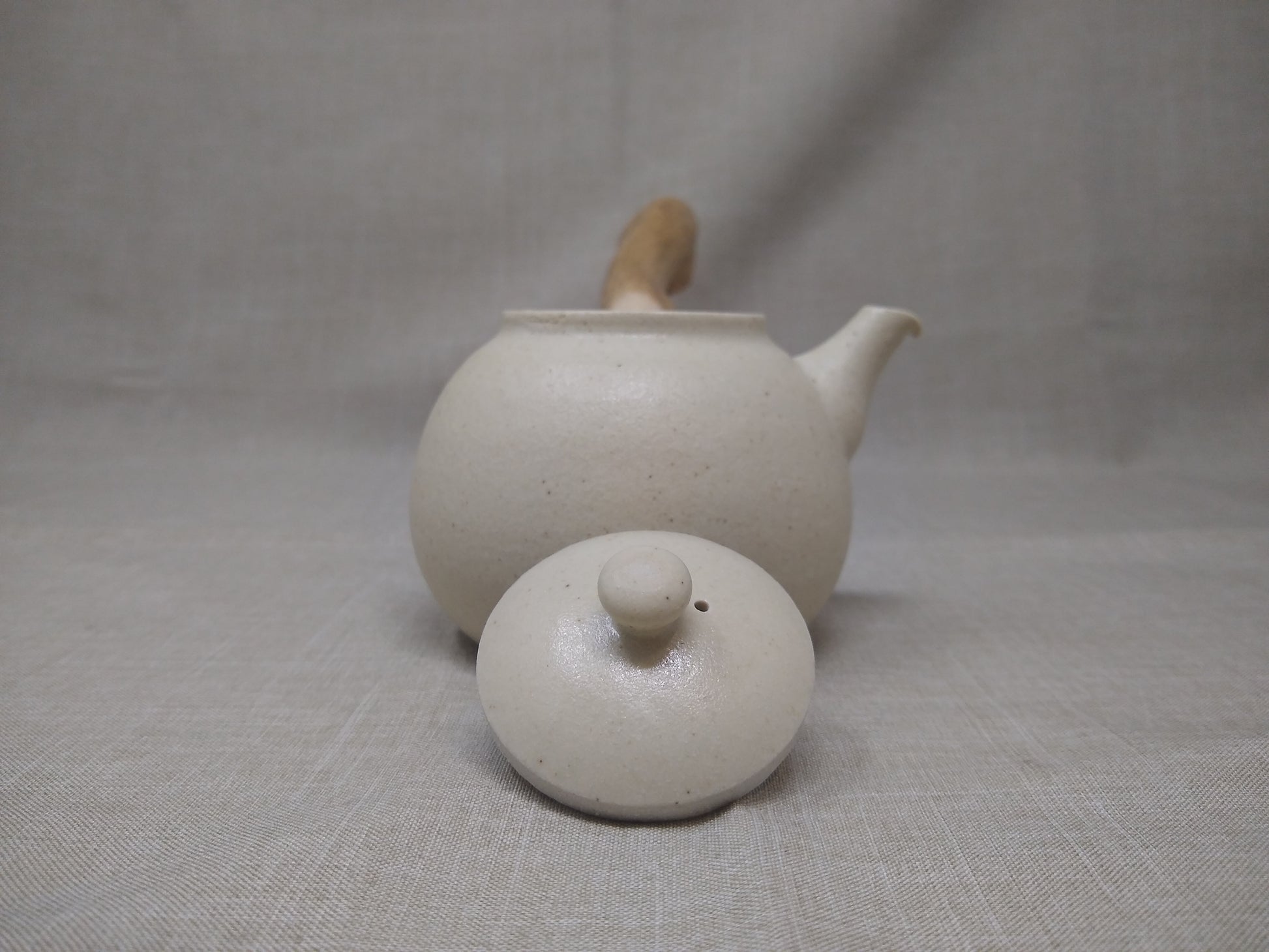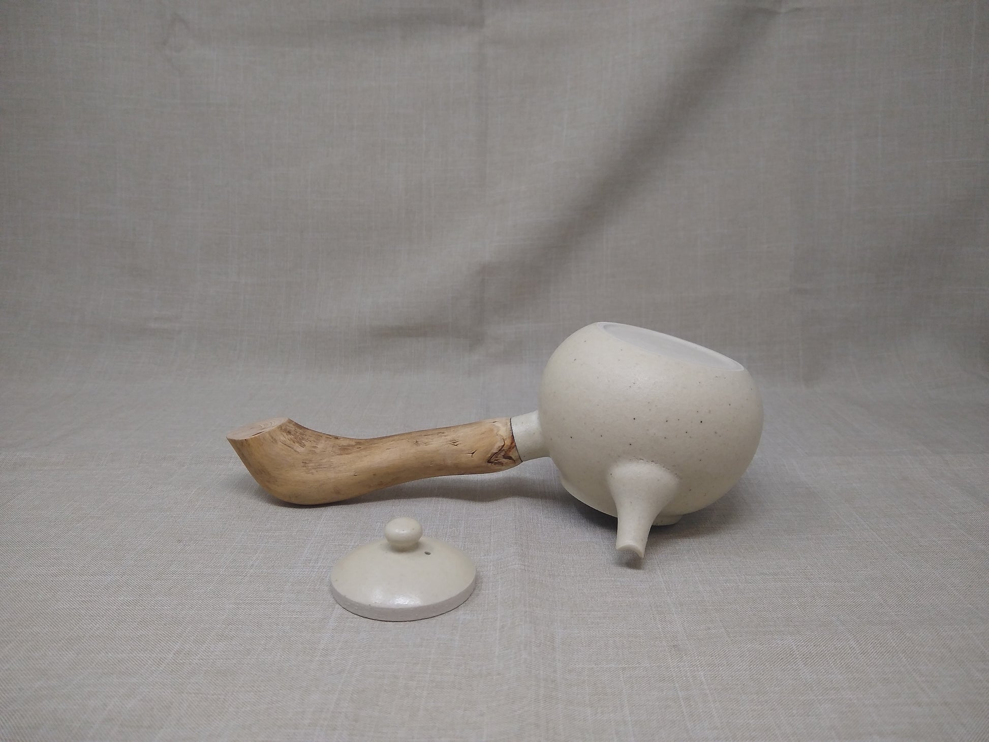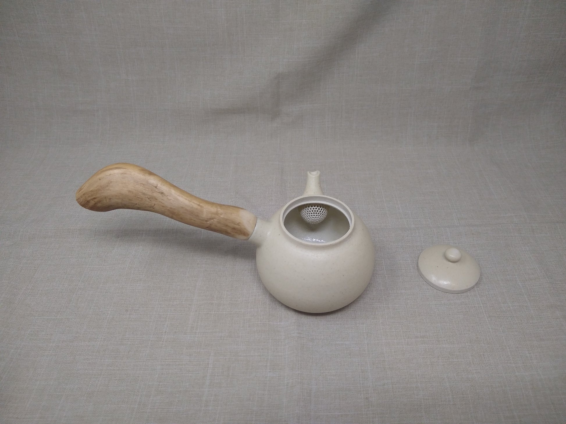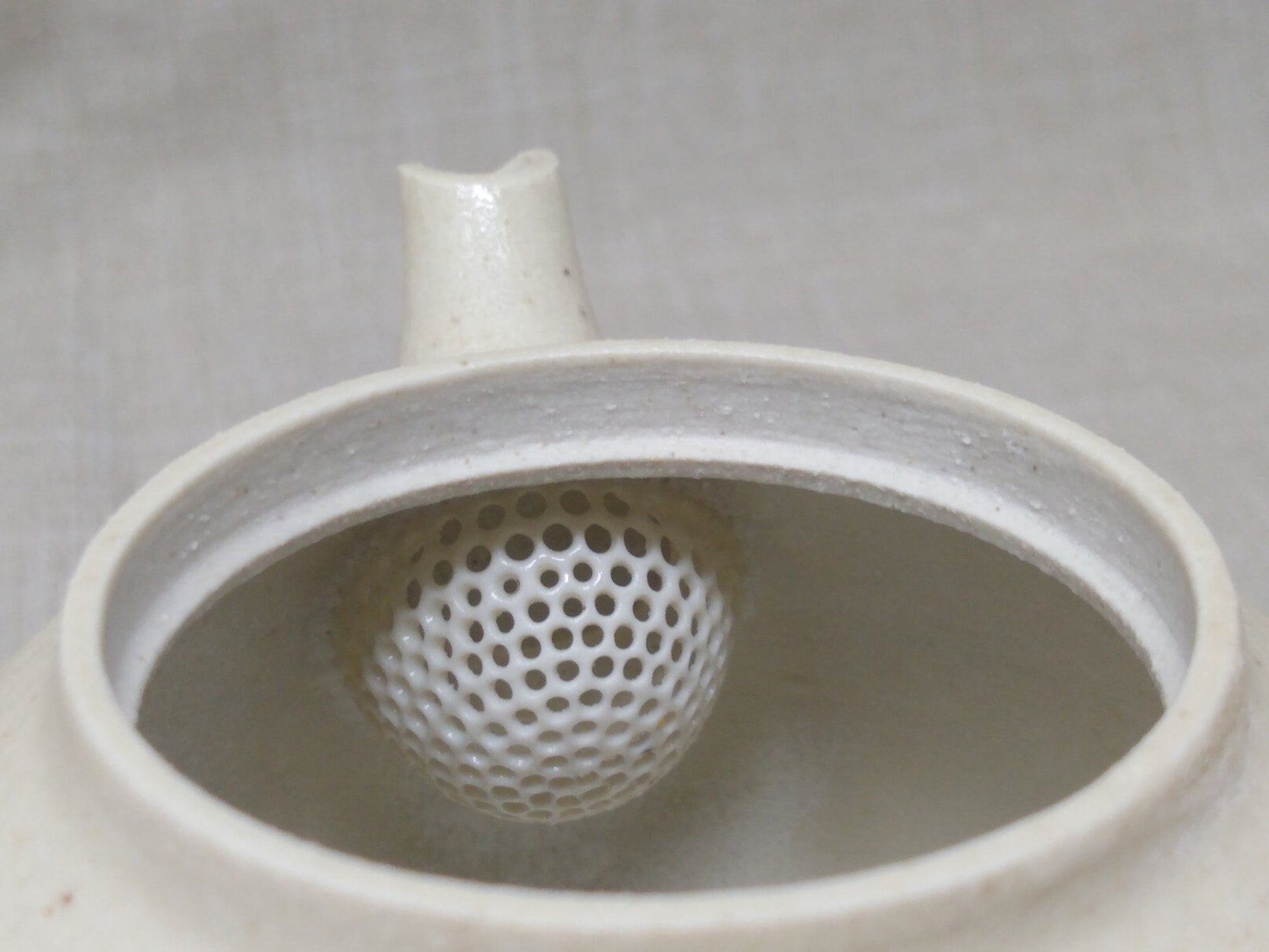 This teapot was made with a mineral rich clay. The exterior is sealed with a matte white glaze. The interior of the teapot has my signature soft white glaze which helps make the color of the tea being steeped more visible. The soft white glaze also allows some of the natural clay features to come forth. The teapot lid is measured and trimmed with precision to ensure that it fits nice and tight. The built in strainer has approximately 259 small holes that are 1 millimeters in diameter. This strainer functions excellent with all teas.