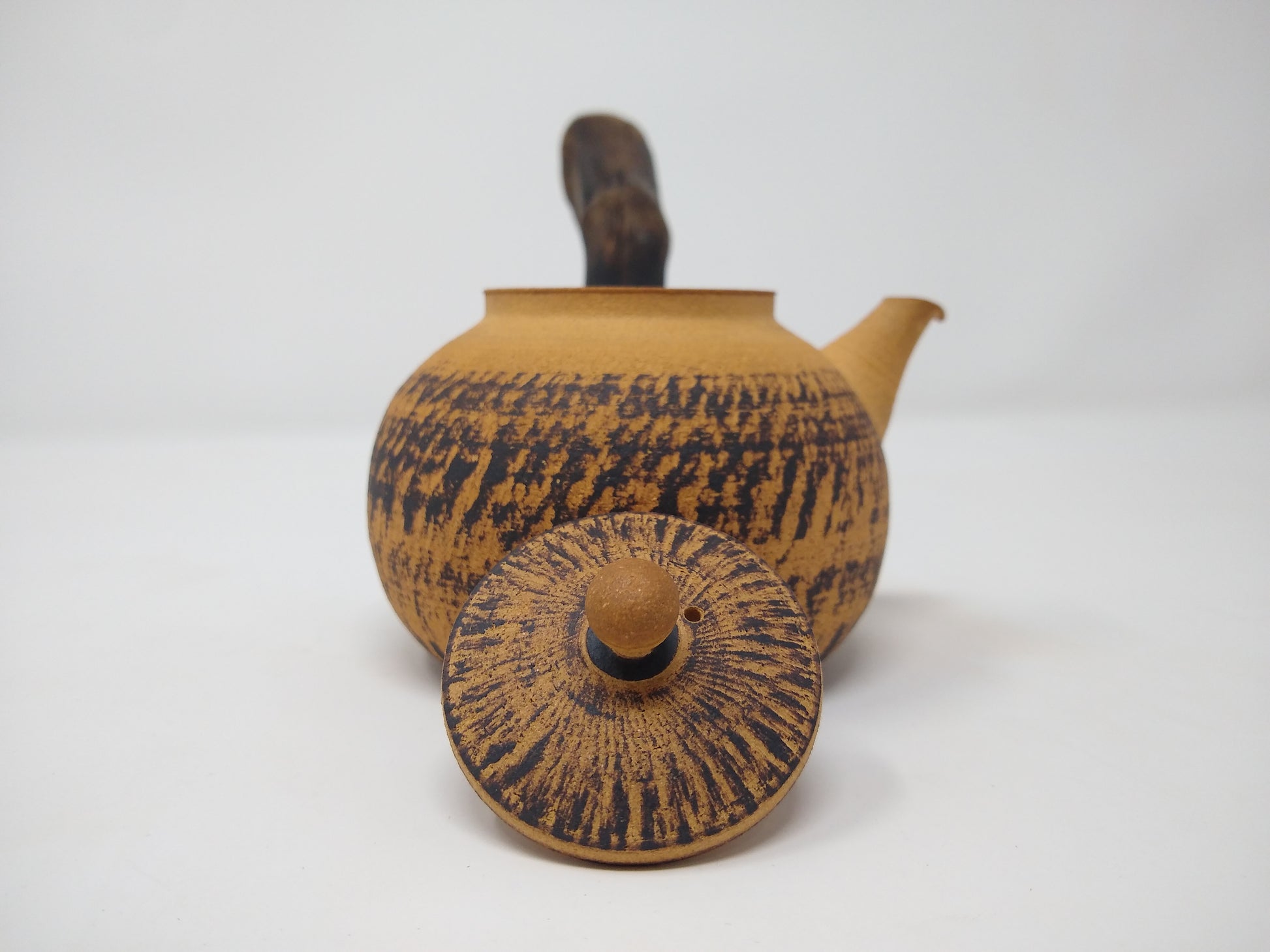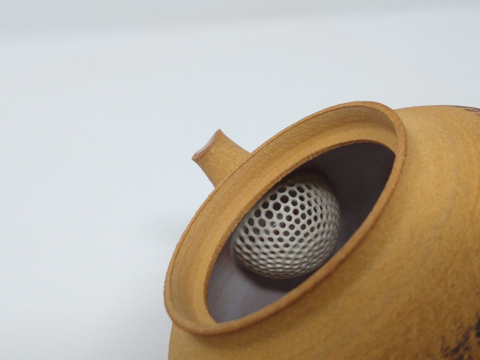 This teapot was made with a mineral rich clay. The exterior is unglazed, showcasing the golden clay and chattered black slip. The interior of the teapot has my signature soft white glaze which helps make the color of the tea being steeped more visible. The soft white glaze also allows some of the natural clay features to come forth. The teapot lid is measured and trimmed with precision to ensure that it fits nice and tight. The built in strainer has approximately 259 small holes that are 1 millimeters in diameter. This strainer functions excellent with all teas.