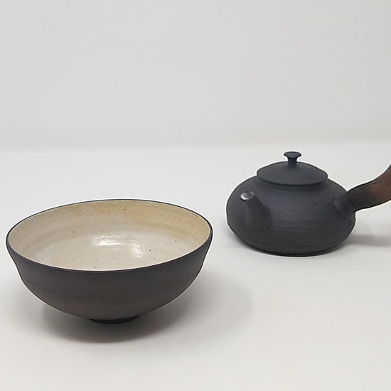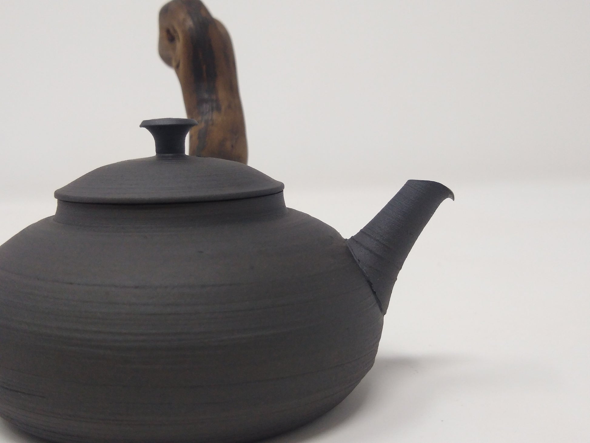 This kyusu was made with a black mineral rich clay. The exterior is not glazed, exposing the marvelous attributes of this clay. The interior of the teapot has my signature soft white glaze which helps make the color of the tea being steeped more visible. The soft white glaze also allows some of the natural clay features to come forth. The teapot lid is measured and trimmed with precision to ensure that it fits nice and tight. The built in strainer has approximately 259 small holes that are 1 millimeters in diameter. This strainer functions excellent with all teas.