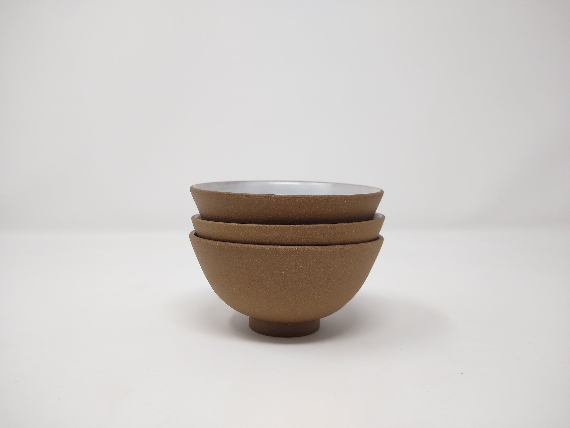 These tea bowls were made with a mineral rich clay. The exterior is unglazed. The interior has my signature soft white glaze which helps make the color of the tea more visible. The soft white glaze also allows some of the natural clay features to come forth.